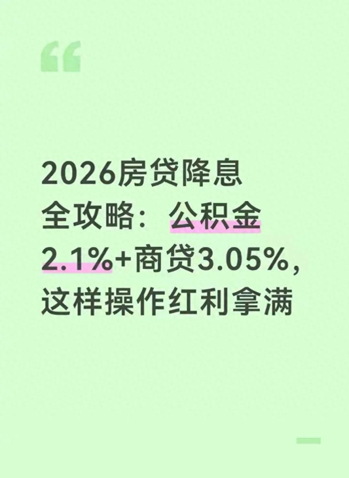 2026年房贷市场的降息大礼包正式落地,央行联合各地公积金管理中心、商业银行推出组合式利率优惠政策,首套公积金贷款利率低至2.1%,商业房贷利率同步下调至3.05%。按照这个利率计算,百万房贷贷30年,最高能省利息超21万元。不管是正在还房贷的存量用户,还是打算买房的刚需群体,只要找对方法,就能把这份政策红利吃透。今天就用大白话拆解2026房贷降息的核心内容,从新贷办理到存量房贷转换,一步步教你怎么操作才能薅到最多实惠。