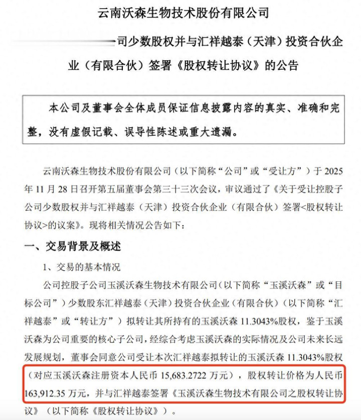 11月28日晚间,沃森生物公告,玉溪沃森少数股东汇祥越泰投资合伙企业拟转让其所持有的玉溪沃森 11.3043%股权,鉴于玉溪沃森为公司重要的核心子公司,经综合考虑玉溪沃森的实际情况及公司未来长远发展规划,董事会同意公司受让本次汇祥越泰拟转让的玉溪沃森 11.3043%股权,股权转让价格为人民币16.39亿元,并与汇祥越泰签署《玉溪沃森生物技术有限公司之股权转让协议》。