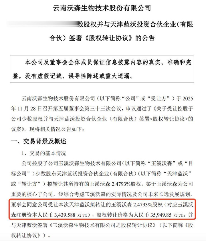 沃森生物同时公告,公司控股子公司玉溪沃森生物技术有限公司少数股东天津蓝沃投资合伙企业拟转让其所持有的玉溪沃森2.4793%股权,董事会同意公司受让本次天津蓝沃拟转让的玉溪沃森2.4793%股权,股权转让价格为人民币3.59亿元,并与天津蓝沃签署《玉溪沃森生物技术有限公司之股权转让协议》。